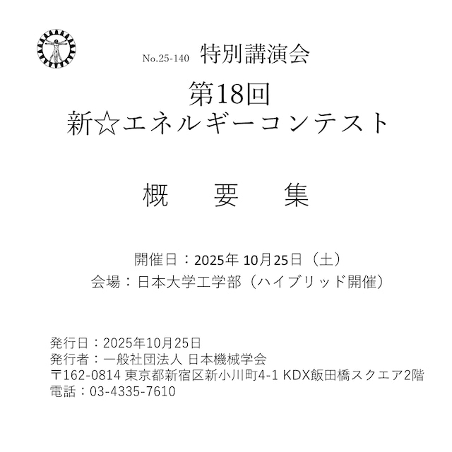 下記行事で発行された講演論文集です。 https://www.jsme.or.jp/event/25-140/ 形式:PDFファイルを含むデータのzipファイル。(ファイル名:25-140特別講演会_概要集_20251025.zip) ※36,593,484バイト ※17件の講演が掲載されております ※講演すべてが収録されているわけではございません(希望者のみ一部収録) ※閲覧にはzipファイルの解凍をした上で、PDFビューワが必要です。 -------------------------------------------------------------------------- 特別講演会「第18回 新☆エネルギーコンテスト」 (No.25-140) 2025年10月25日 主催:一般社団法人日本機械学会 技術と社会部門 開催場所;日本大学工学部およびオンラインのハイブリッド開催 共催・協賛:日本大学工学部,一般社団法人日本機械学会環境工学部門,株式会社アルトナー,株式会社内藤工業所,日本大学工学部校友会,前澤給装工業株式会社 出版日:2025年10月25日 --------------------------------------------------------------------------